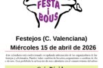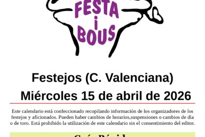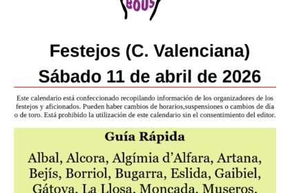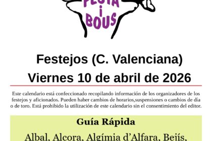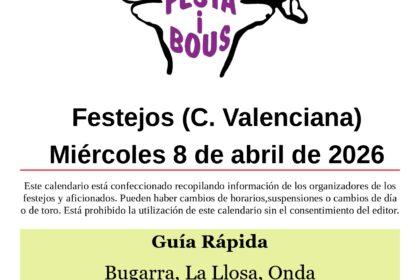 Bugarra (V)Pascua Taurina Miércoles 8 13:30 Entrada y vacas de Hnos. Navarro Morell18:00 Vacas de Miguel Ángel Mínguez23:30 Toro embolado de Miguel Ángel Mínguez La Llosa (CS)Sant Vicent Ferrer Miérco...