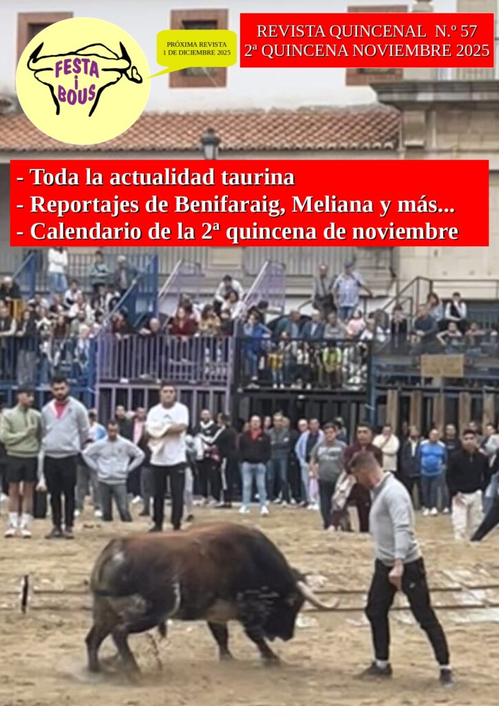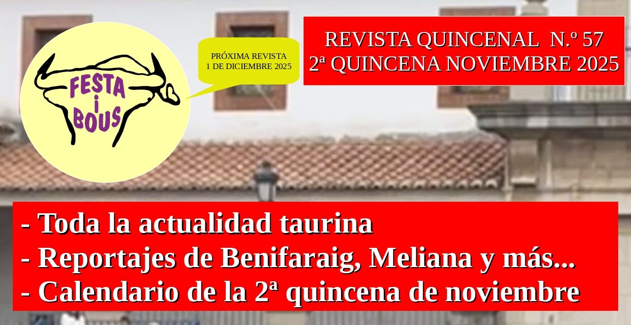 Ya tenéis disponible el número 57 de la revista Festa i Bous. En ella además de encontrar las noticias y reportajes más destacados del sector podréis encontrar un amplio y completo calendario de la segunda quincena del mes de noviembre de la comunidad valenciana.