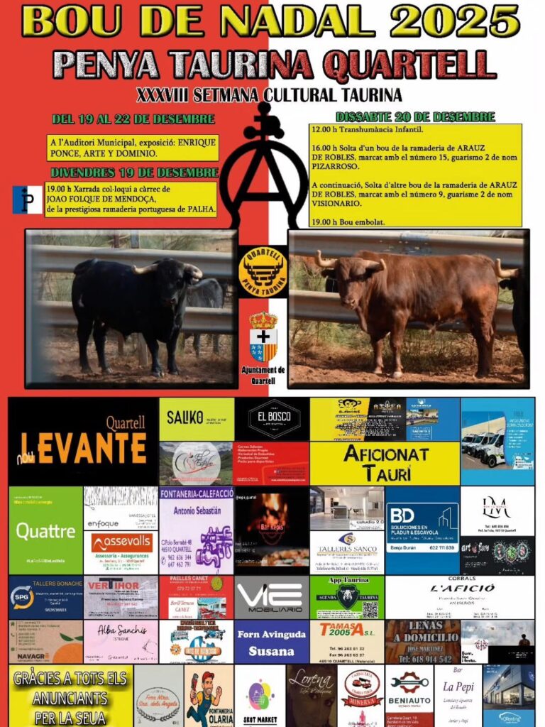 La Penya Taurina Quartell ha presentado el cartel de su ya tradicional «Bou de Nadal». Una fecha marcada para muchos aficionados al verse en las calles los últimos toros cerriles del año. Quartell celebrará el «Bou de Nadal» el próximo 20 de diciembre en el que exhibirá dos astado de Arauz de Robles. Una cita muy esperada la que reunirá a multitud de aficionados para disfrutar de una gran tarde taurina en Quartell.