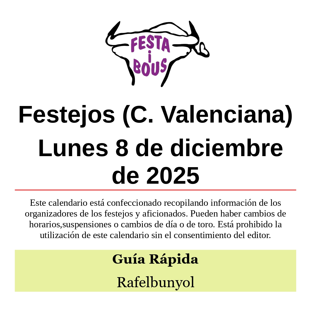 Festejos (C.Valenciana) Lunes 8 de diciembre de 20257 diciembre, 2025 Rafelbunyol (V)Feria de InviernoPT Els Jovens – Finca Buenasombra Lunes 8 17:00 Especial Vicente Domínguez (€) Relacionado Compartir Posts Relacionados Calendario 2ª quincena enero 2026 15 enero, 2026 Festejos (C. Valenciana) Domingo 11 de enero de 2026 10 enero, 2026 Festejos (C Valenciana) Sábado 10 de enero de 2026 9 enero, 2026 Deje un comentario Cancelar la respuestaTu dirección de correo electrónico no será publicada. Los campos obligatorios están marcados con *ComentarioNombre * Correo electrónico * Web Guarda mi nombre, correo electrónico y web en este navegador para la próxima vez que comente.