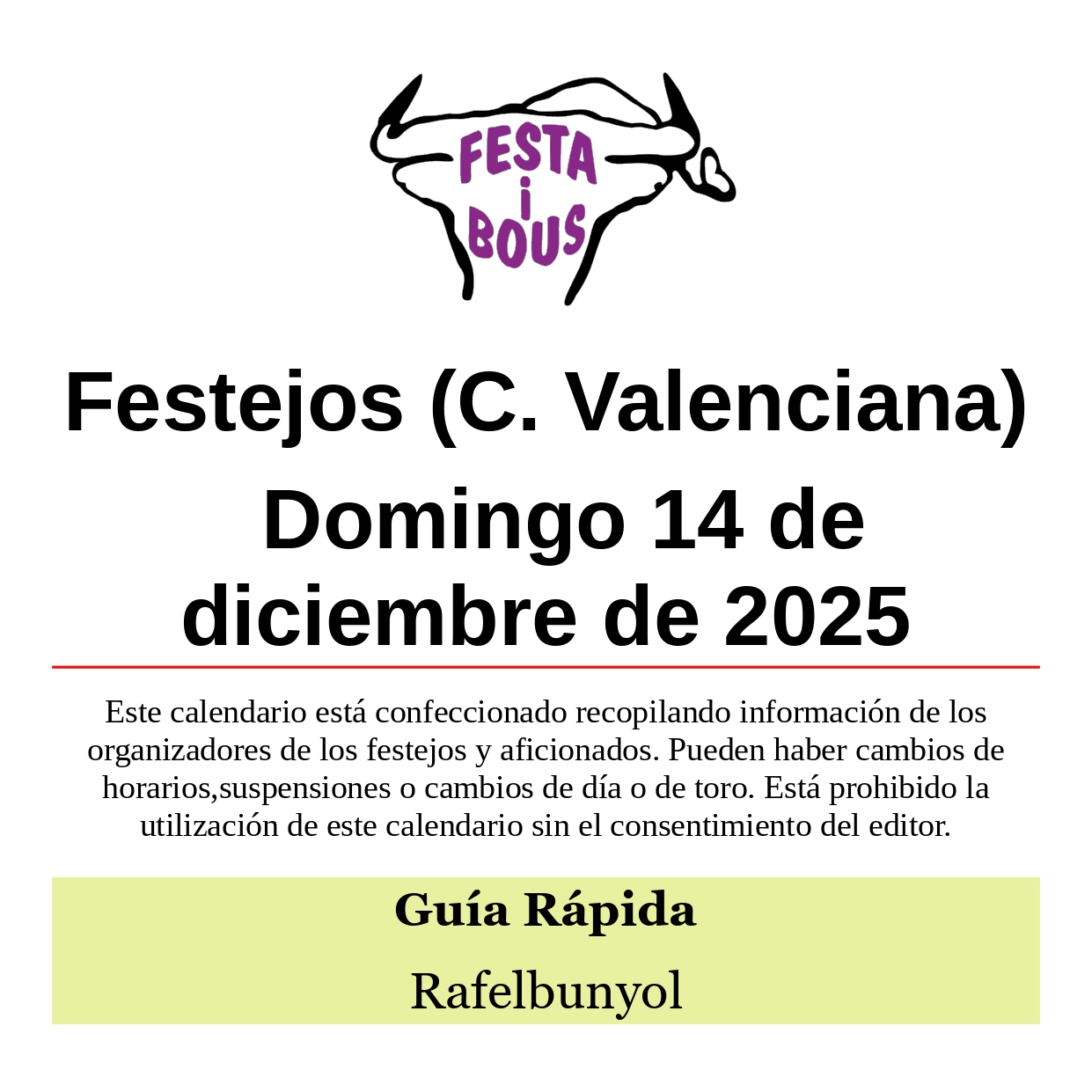 Festejos (C.Valenciana) Domingo 14 de diciembre de 202513 diciembre, 2025 Rafelbunyol (V)Feria de InviernoPT Els Jovens – Finca Buenasombra Domingo 14 17:00 Concurso local de recortadores (€) (Aplazado al domingo 21 de diciembre de 2025) Relacionado Compartir Posts Relacionados Calendario 2ª quincena enero 2026 15 enero, 2026 Festejos (C. Valenciana) Domingo 11 de enero de 2026 10 enero, 2026 Festejos (C Valenciana) Sábado 10 de enero de 2026 9 enero, 2026 Deje un comentario Cancelar la respuestaTu dirección de correo electrónico no será publicada. Los campos obligatorios están marcados con *ComentarioNombre * Correo electrónico * Web Guarda mi nombre, correo electrónico y web en este navegador para la próxima vez que comente.