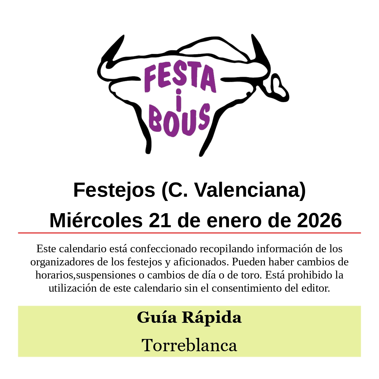 Festejos (C. Valenciana) Miércoles 21 de enero de 202621 enero, 2026 Torreblanca (CS)Sant Antoni i Santa Llúcia Miércoles 21 17:00 Vacas de La Ribera23:00 Dos toros embolados de La Ribera Relacionado Compartir Posts Relacionados Festejos (C. Valenciana) Domingo 1 de marzo de 2026 28 febrero, 2026 Festejos (C. Valenciana) Sábado 28 de febrero de 2026 27 febrero, 2026 Festejos (C. Valenciana) Viernes 27 de febrero de 2026 26 febrero, 2026 Deje un comentario Cancelar la respuestaTu dirección de correo electrónico no será publicada. Los campos obligatorios están marcados con *ComentarioNombre * Correo electrónico * Web Guarda mi nombre, correo electrónico y web en este navegador para la próxima vez que comente.