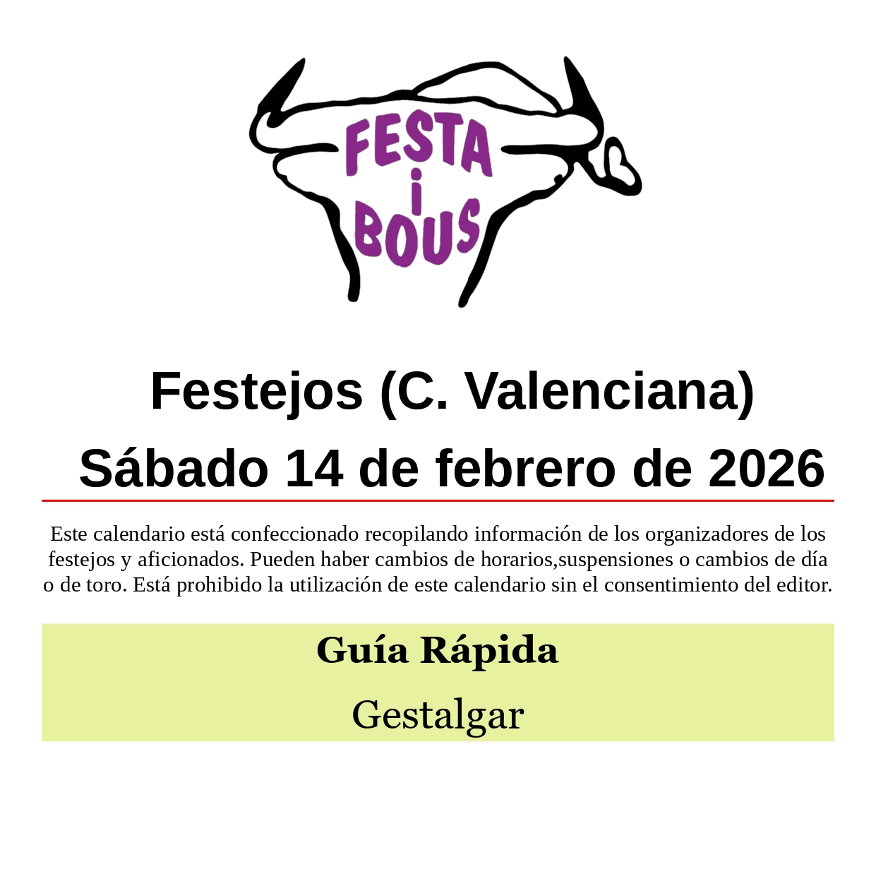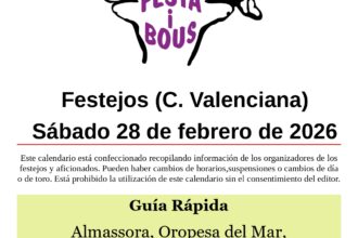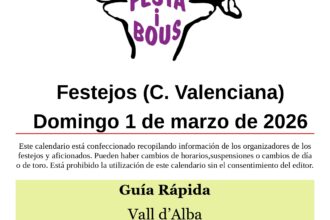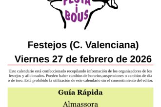Festejos (C. Valenciana) Sábado 14 de febrero de 202613 febrero, 2026 Gestalgar (V)San Blas – Asociación Taurina Sábado 14 10:00 Tres toros en cuerda de Héctor López Relacionado Compartir Posts Relacionados Festejos (C. Valenciana) Domingo 1 de marzo de 2026 28 febrero, 2026 Festejos (C. Valenciana) Sábado 28 de febrero de 2026 27 febrero, 2026 Festejos (C. Valenciana) Viernes 27 de febrero de 2026 26 febrero, 2026 Deje un comentario Cancelar la respuestaTu dirección de correo electrónico no será publicada. Los campos obligatorios están marcados con *ComentarioNombre * Correo electrónico * Web Guarda mi nombre, correo electrónico y web en este navegador para la próxima vez que comente.