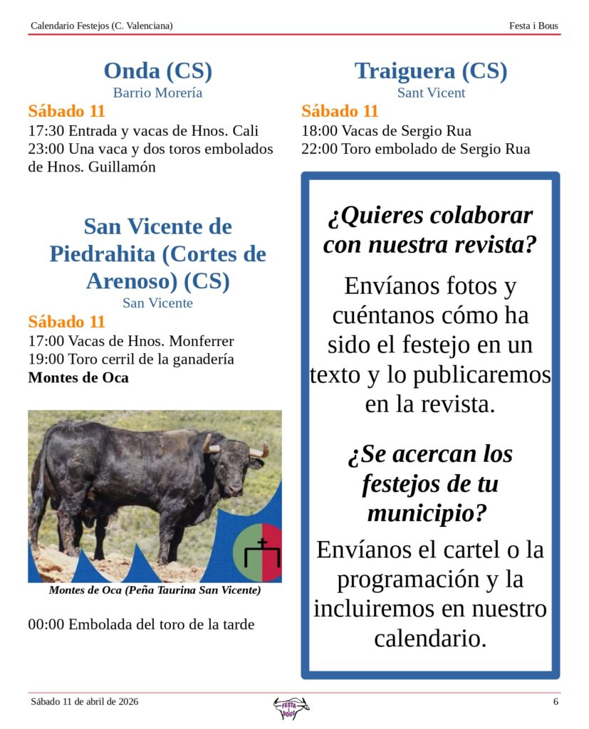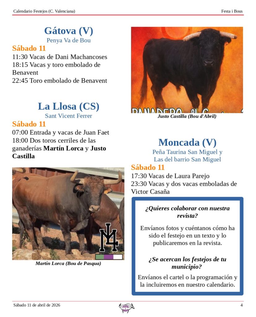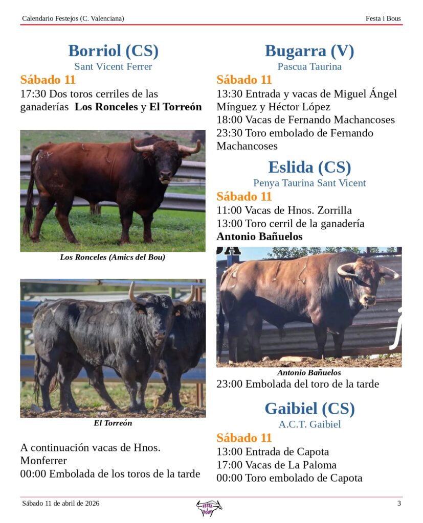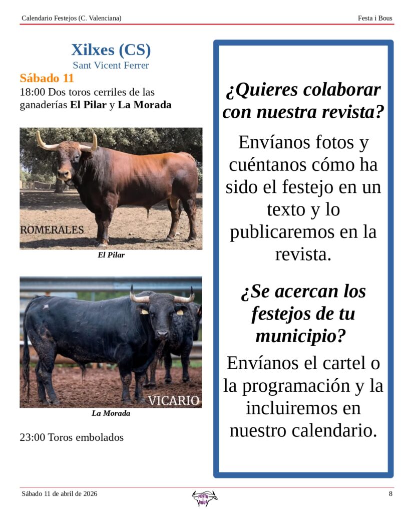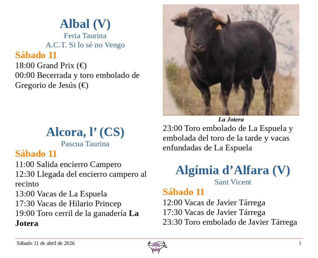 Festejos (C. Valenciana) Sábado 11 de abril de 202610 abril, 2026 Descárgalo en PDF abajo. Festa i Bous – Festejos (CV) 11 de abril 2026Descarga Relacionado Compartir Deje un comentario Cancelar la respuestaTu dirección de correo electrónico no será publicada. Los campos obligatorios están marcados con *ComentarioNombre * Correo electrónico * Web Guarda mi nombre, correo electrónico y web en este navegador para la próxima vez que comente.