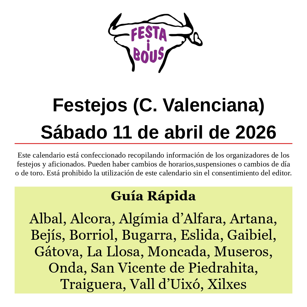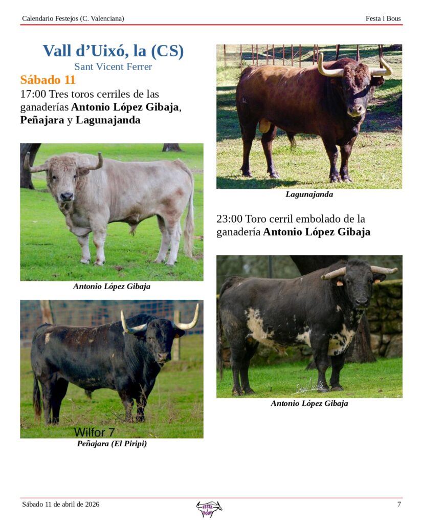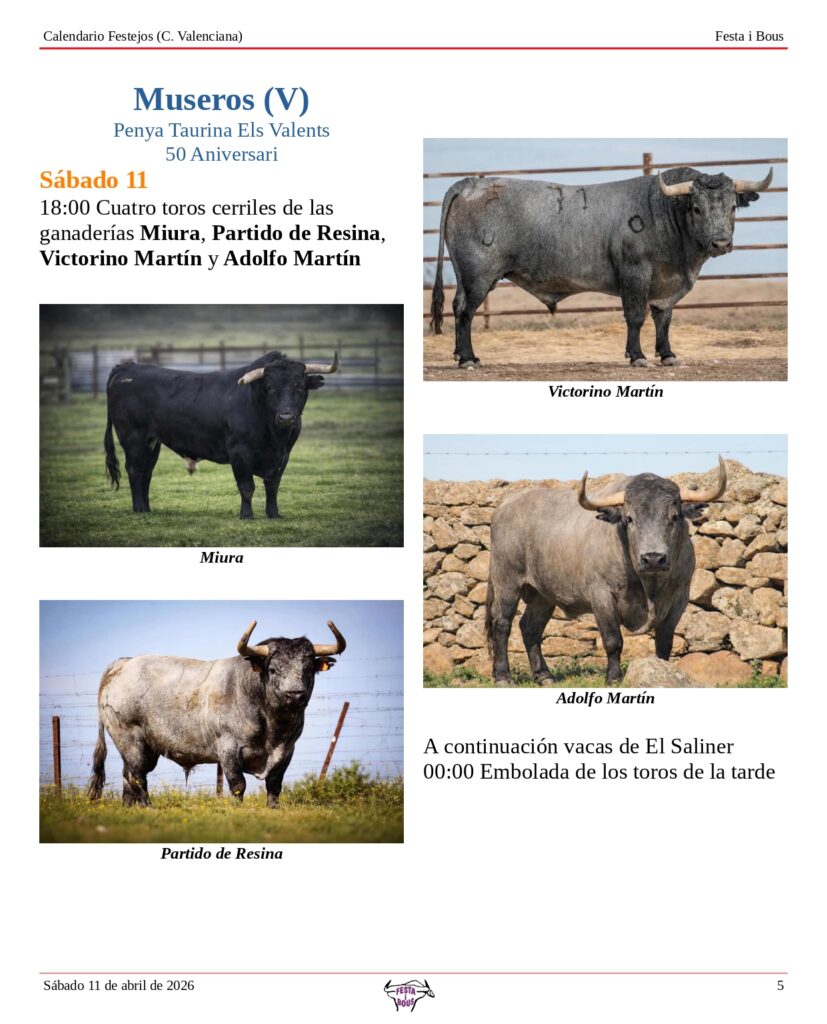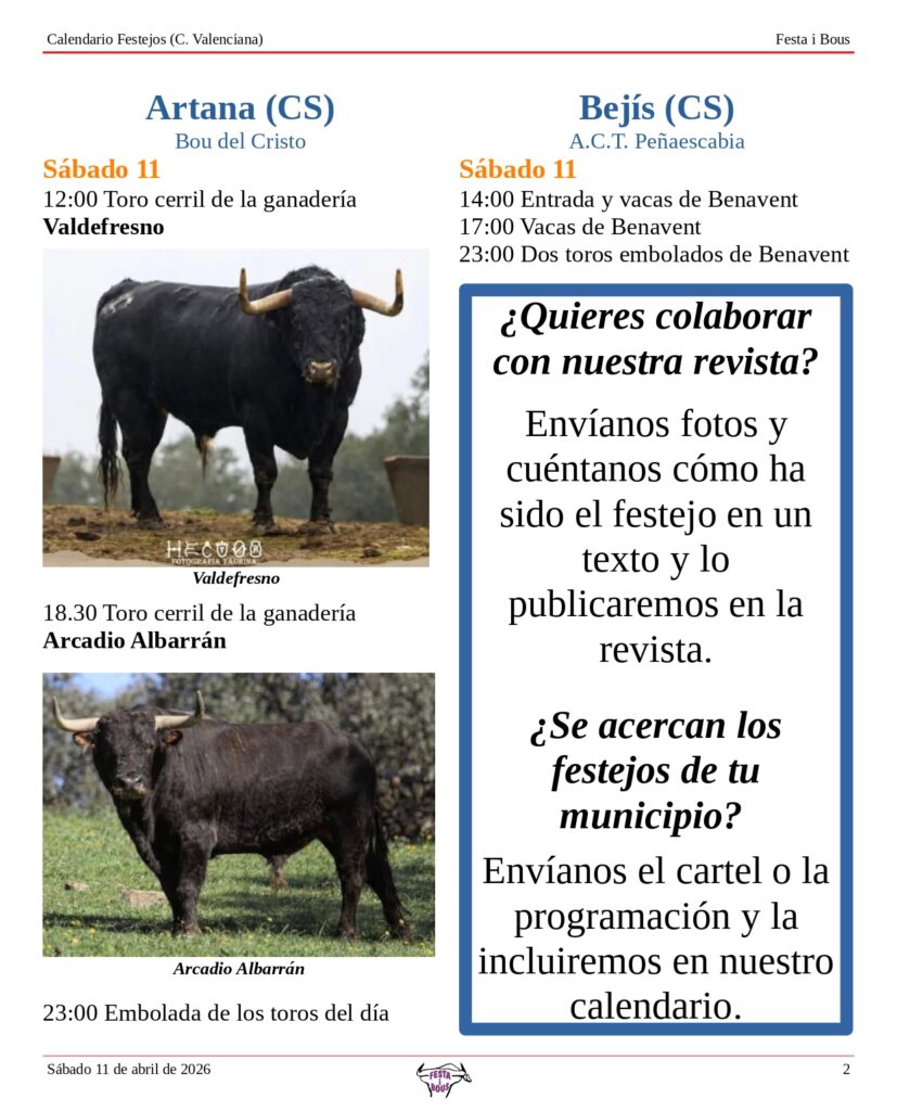 Festejos (C. Valenciana) Sábado 11 de abril de 202610 abril, 2026 Descárgalo en PDF abajo. Festa i Bous – Festejos (CV) 11 de abril 2026Descarga Relacionado Compartir Deje un comentario Cancelar la respuestaTu dirección de correo electrónico no será publicada. Los campos obligatorios están marcados con *ComentarioNombre * Correo electrónico * Web Guarda mi nombre, correo electrónico y web en este navegador para la próxima vez que comente.