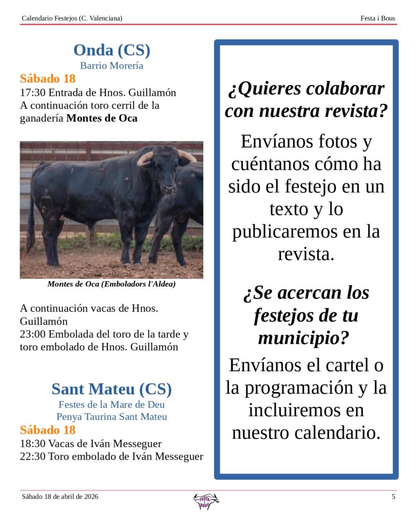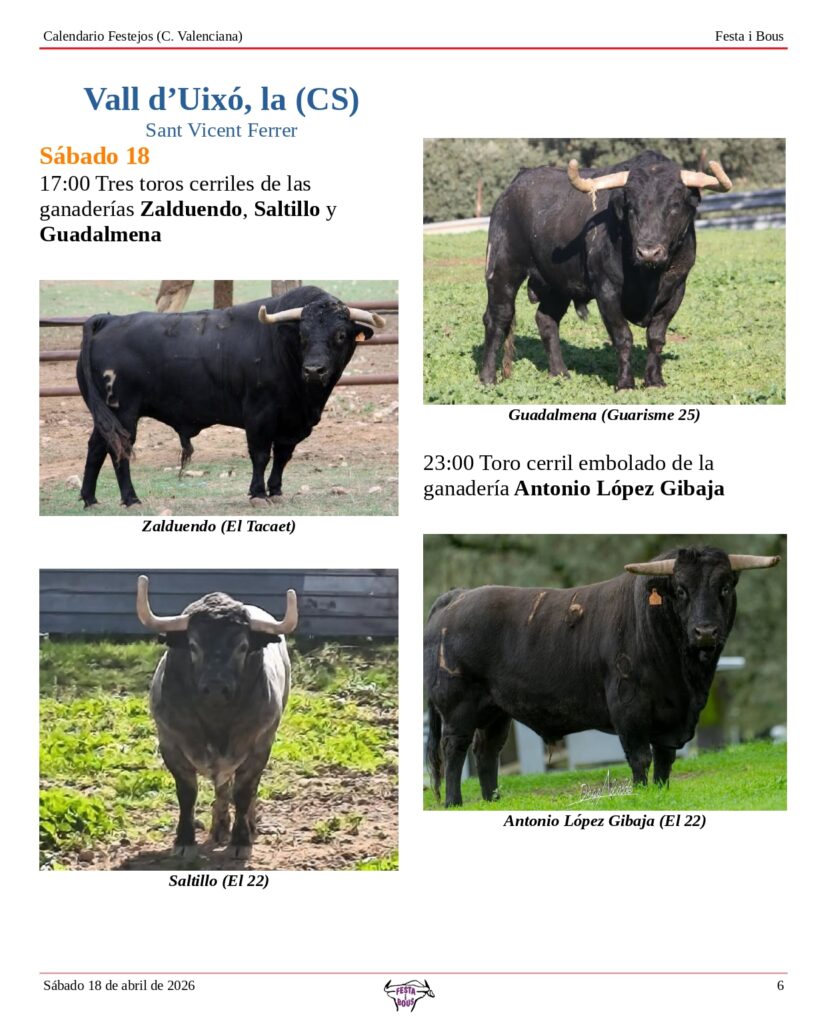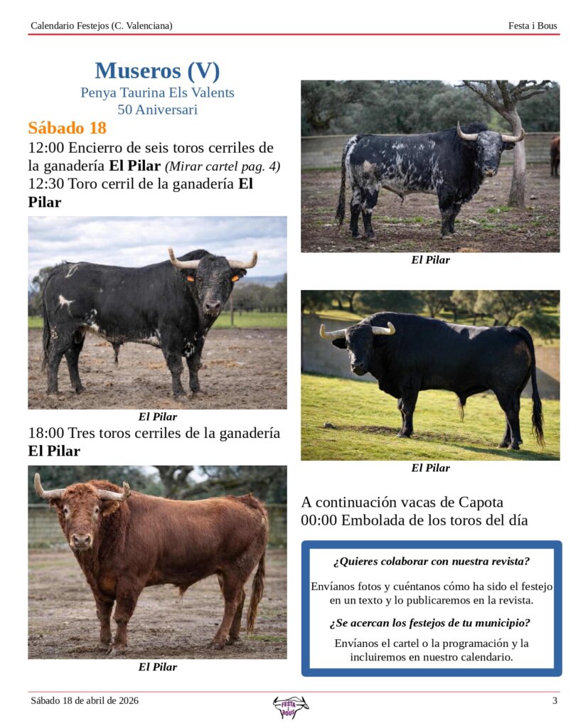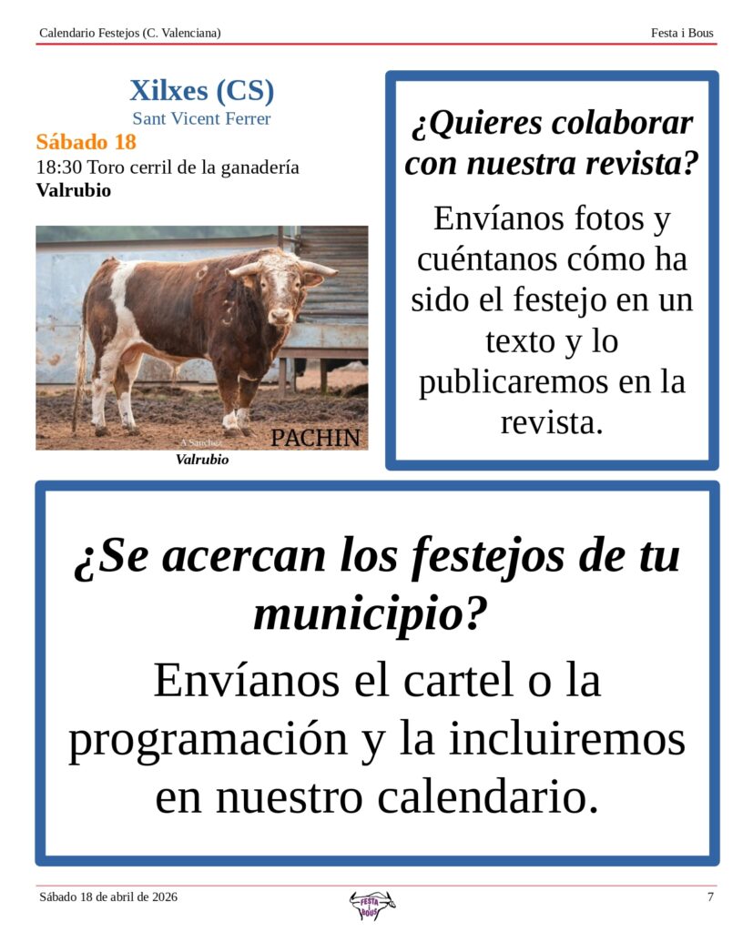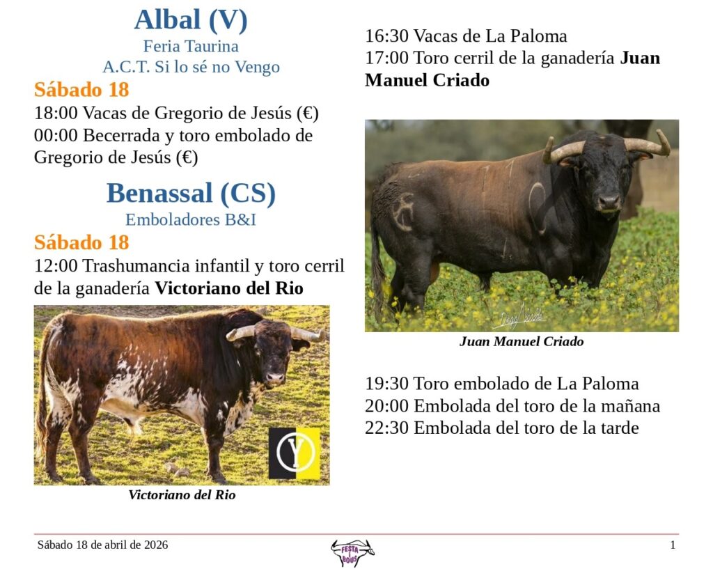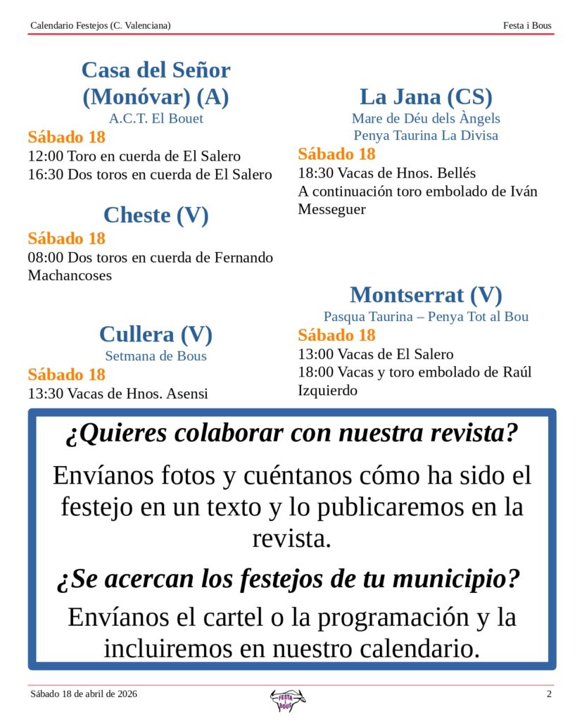 Festejos (C. Valenciana) Sábado 18 de abril de 202617 abril, 2026 Descárgalo en PDF abajo. Festa i Bous – Festejos (CV) 18 de abril 2026Descarga Relacionado Compartir Posts Relacionados Festejos (C. Valenciana) Domingo 19 de abril de 2026 18 abril, 2026 Festejos (C. Valenciana) Viernes 17 de abril de 2026 16 abril, 2026 Festejos (C. Valenciana) Jueves 16 de abril de 2026 15 abril, 2026 Deje un comentario Cancelar la respuestaTu dirección de correo electrónico no será publicada. Los campos obligatorios están marcados con *ComentarioNombre * Correo electrónico * Web Guarda mi nombre, correo electrónico y web en este navegador para la próxima vez que comente.