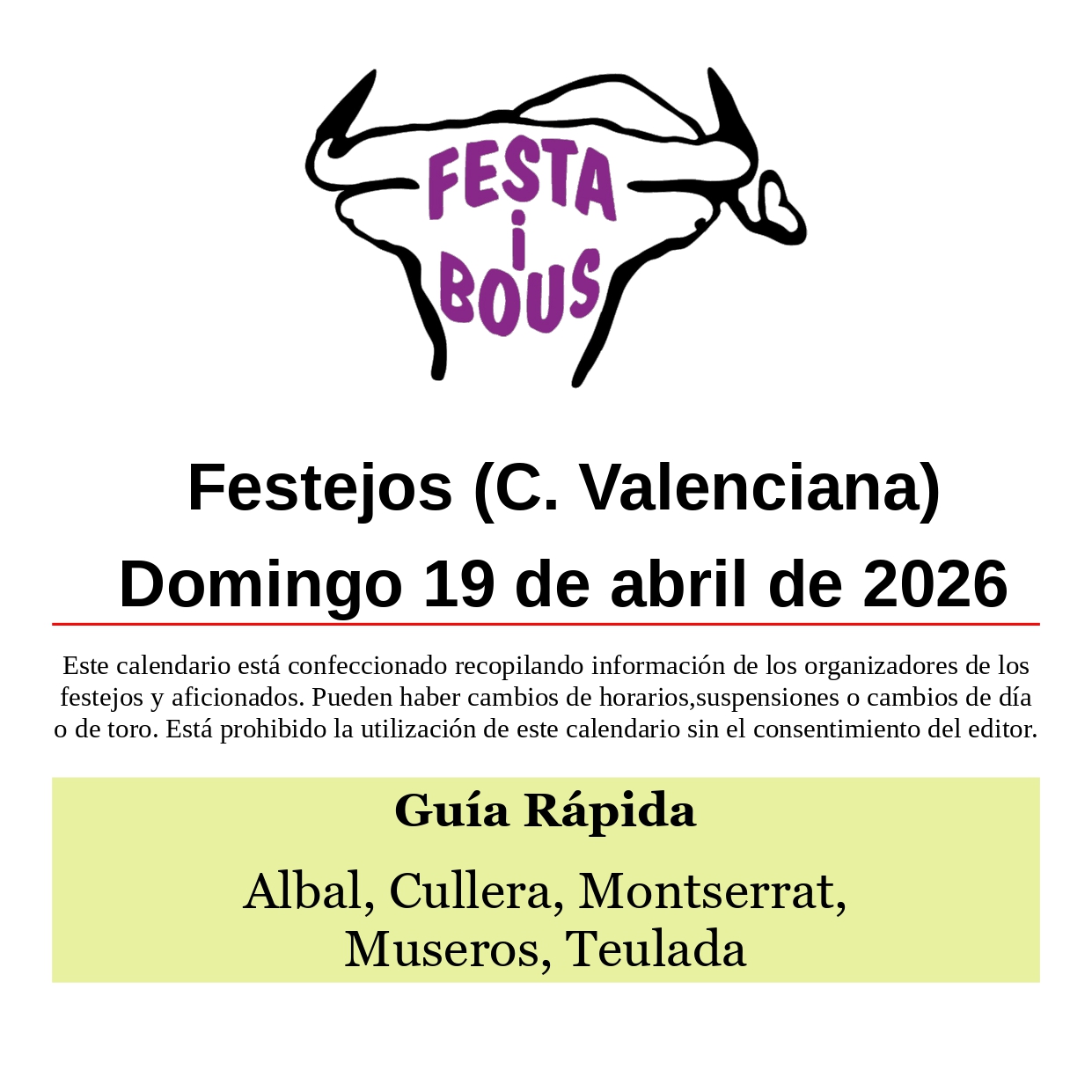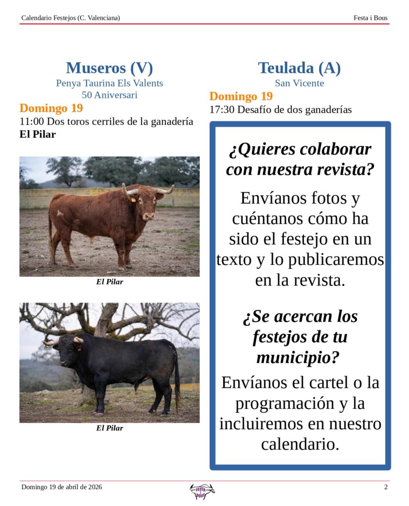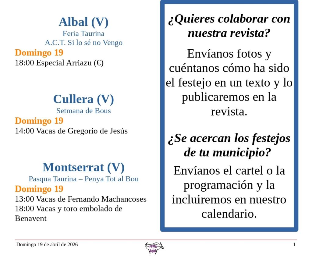 Festejos (C. Valenciana) Domingo 19 de abril de 202618 abril, 2026 Descárgalo en PDF abajo. Festa i Bous – Festejos (CV) 19 de abril 2026Descarga Relacionado Compartir Posts Relacionados Festejos (C. Valenciana) Sábado 18 de abril de 2026 17 abril, 2026 Festejos (C. Valenciana) Viernes 17 de abril de 2026 16 abril, 2026 Festejos (C. Valenciana) Jueves 16 de abril de 2026 15 abril, 2026 Deje un comentario Cancelar la respuestaTu dirección de correo electrónico no será publicada. Los campos obligatorios están marcados con *ComentarioNombre * Correo electrónico * Web Guarda mi nombre, correo electrónico y web en este navegador para la próxima vez que comente.
