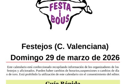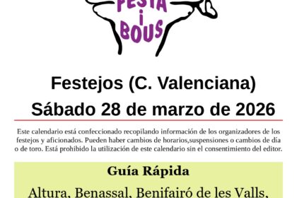 Altura (CS)Fiestas del Berro Domingo 29 13:00 Entrada y vacas de Ivanet17:30 Vacas de Ramón BenetA continuación salida y toro embolado de Ramón Benet El Puig (V)Feria TaurinaClavaris Sant Roc 2026 Dom...