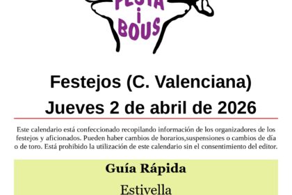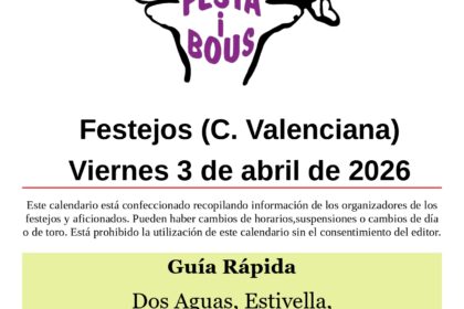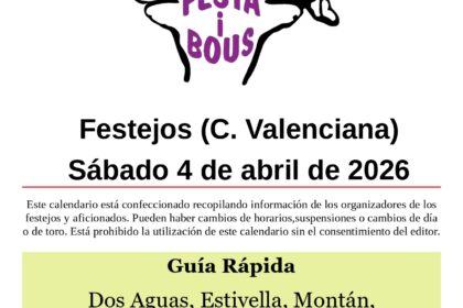 Dos Aguas (V)Peña Taurina El Cubill Sábado 4 08:00 Toro en cuerda de El Salero12:00 Vacas de Ivanet18:00 Vacas de Benavent23:00 Vacas y toro embolado de El Salero Estivella (V)Bous de Pasqua Sábado 4 ...