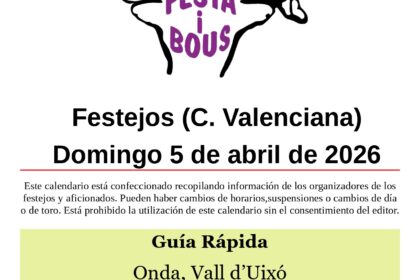 Bugarra (V)Pascua Taurina Martes 7 13:30 Entrada y vacas de El Salero18:00 Vacas de Laura Parejo23:30 Toro embolado de Laura Parejo La Llosa (CS)Sant Vicent Ferrer Martes 7 18:30 Toro cerril de Hnos. ...