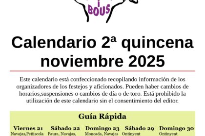 Faura (V)Bou de la Fira Sábado 22 17:00 Toro cerril de la ganadería de Núñez del Cuvillo A continuación vacas de Sergio Rua (Joventud Taurina)20:00 Toro embolado Moncada (V)Bou en corda Domingo 23 08:...