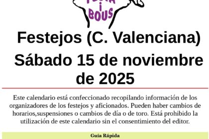 Benavites (V)Bou de Benicalaf Sábado 15 11:00 Vacas de Lorena Fuertes16:00 Tres toros cerriles de las ganaderías de Hato Blanco, El Pilar y Montealto 19:00 Embolada de dos toros de la tarde Massamagre...